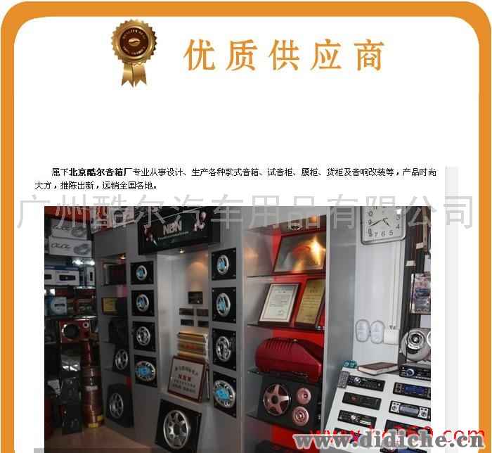 热卖中 广州酷尔汽车音响厂,长期大量供应KUERLE牌各种款式高档汽车低音炮,线材,音响柜。可定做,量大从优。详情广州020-87221226/87221223 北京010-63768211/63769373 QQ:836638739 沈经理 广州酷尔汽车音响厂的北方分公司,工厂座落在交通发达,环境优美的广州白云区太和大源工业区,销售总部位于广州永福路。广州酷尔汽车音响是一家集汽车音响的生产,代理,销售,服务为一体的公司。专业生产批发喇叭,低音炮,功放,音响器材,音箱,试音柜,产品时尚大方,远销东南亚,欧美,台湾,大陆及世界各地市场。本公司拥有完整、科学的质量管理体系,确保产品质量的稳定性。秉承互惠双赢,诚信至上的经营理念,为客户提供更多优质的产品和服务。欢迎各界朋友莅临本公司参观、指导和业务洽谈。 是否提供加工定制 是 适用车型 . 电压 12(V) 最大功率 .(W) 外观材质 来电咨询 本公司还供应以下试音柜: